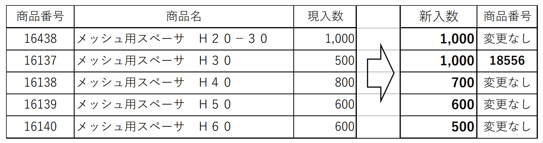 メッシュ用スペーサの荷姿変更と入数変更のご案内